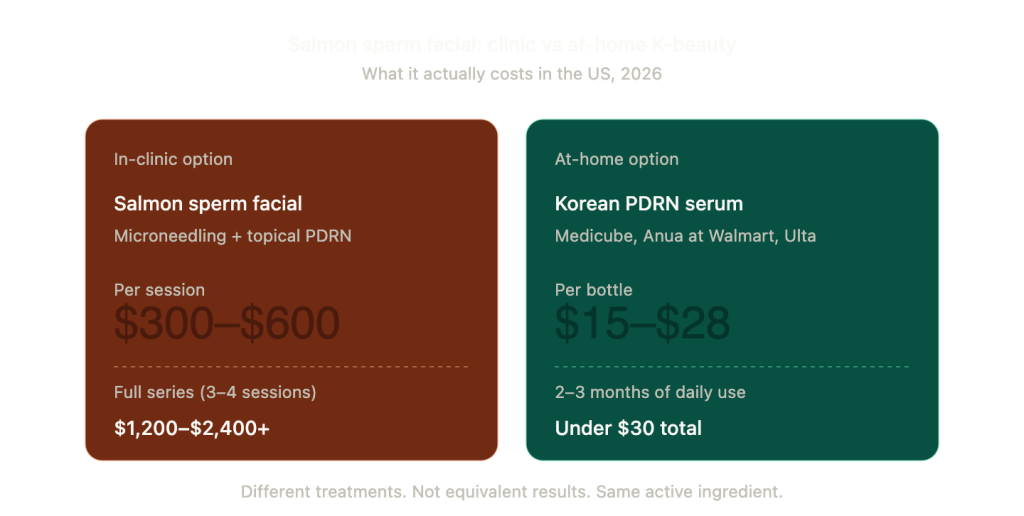 For the in-clinic salmon sperm facial (microneedling plus PDRN topical, the common US version): most clinics charge between $300 and $600 per session. The cost varies based on factors like the clinic’s location, the provider’s reputation, and experience level. Florida clinics typically range from $500 to $800 per session. A high-end NYC or LA clinic can easily push past $1,000.